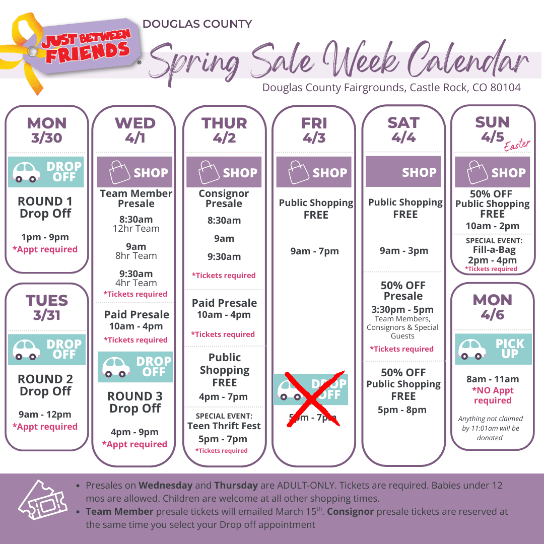 EARLY SHOPPING: As a Consignor (seller) you can get up to four Presale tickets to shop Thursday, April 2nd; plus four more tickets to the Half-Price Presale! Team members (helpers)